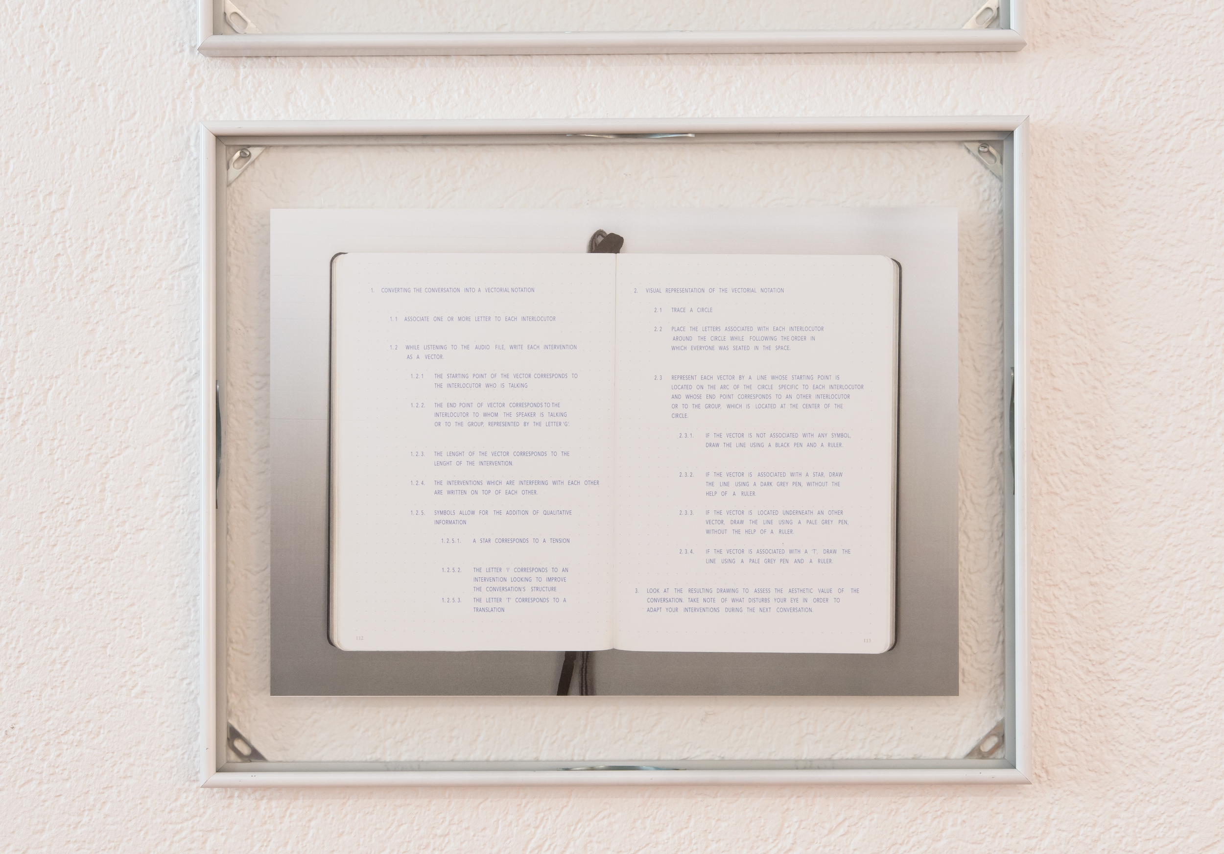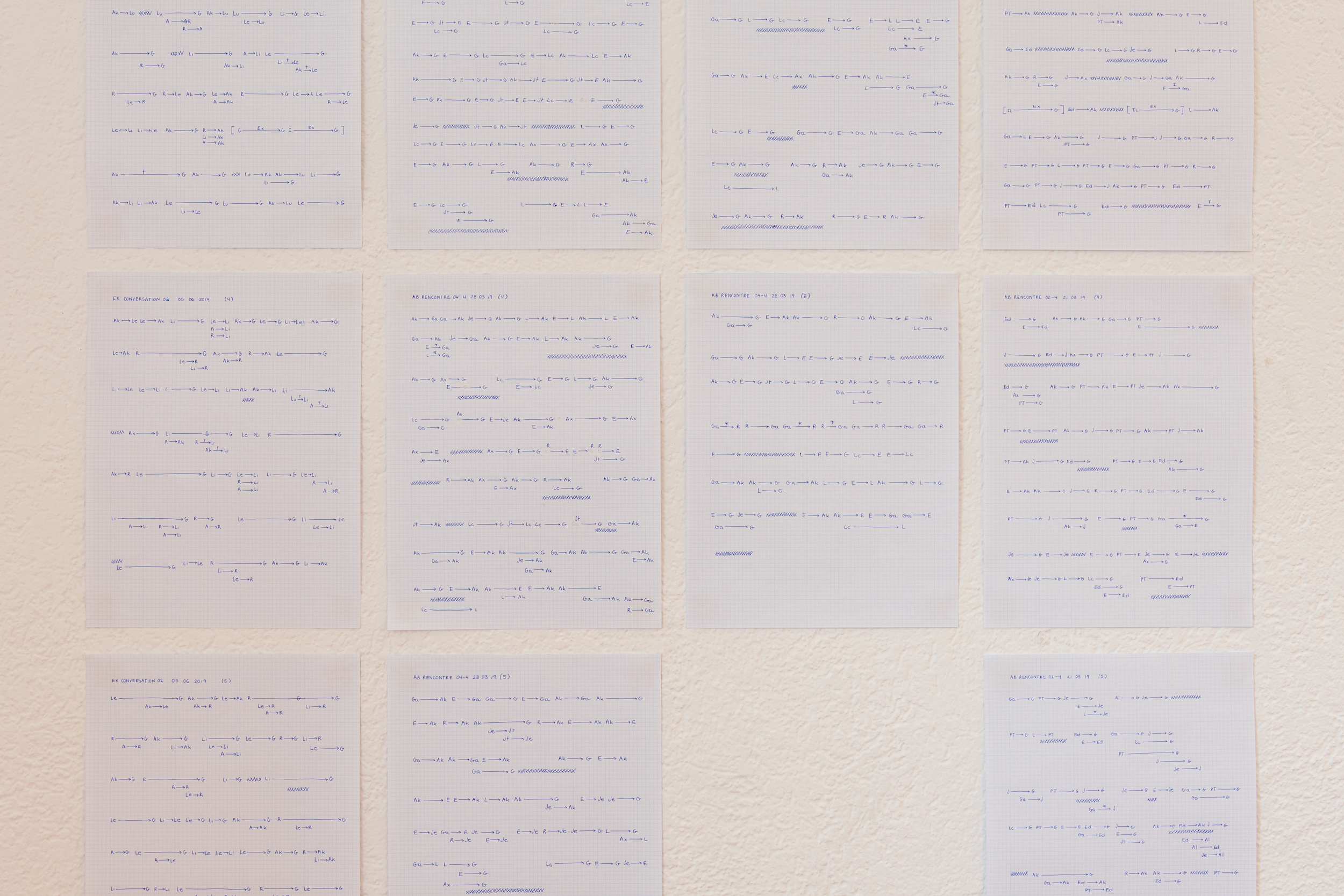 Die Diagramme unterstützen Anouk Verviers bei der Beurteilung jedes Gesprächs, um das nächste zu planen und bieten eine Möglichkeit, spezifische Qualitäten in der Gruppe zu extrahieren und zu analysieren. In dieser Ausstellung werden die systematischen Schritte zur Transformation von Gesprächen in eine Datenmatrix in die Installation einbezogen. So erhalten Künstler*innen, Teilnehmer*innen und Betrachter*innen Zugang zu einem analytischen Raum, in dem spezifische soziale Dynamiken aus ästhetischer Sicht betrachtet und verglichen werden können.