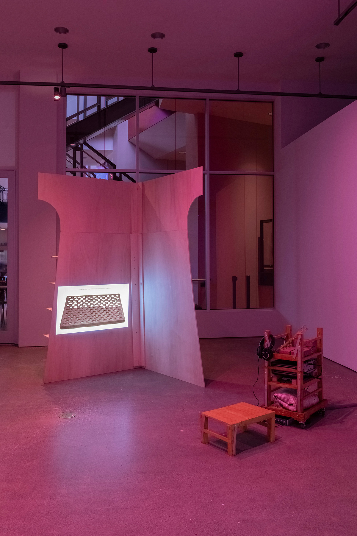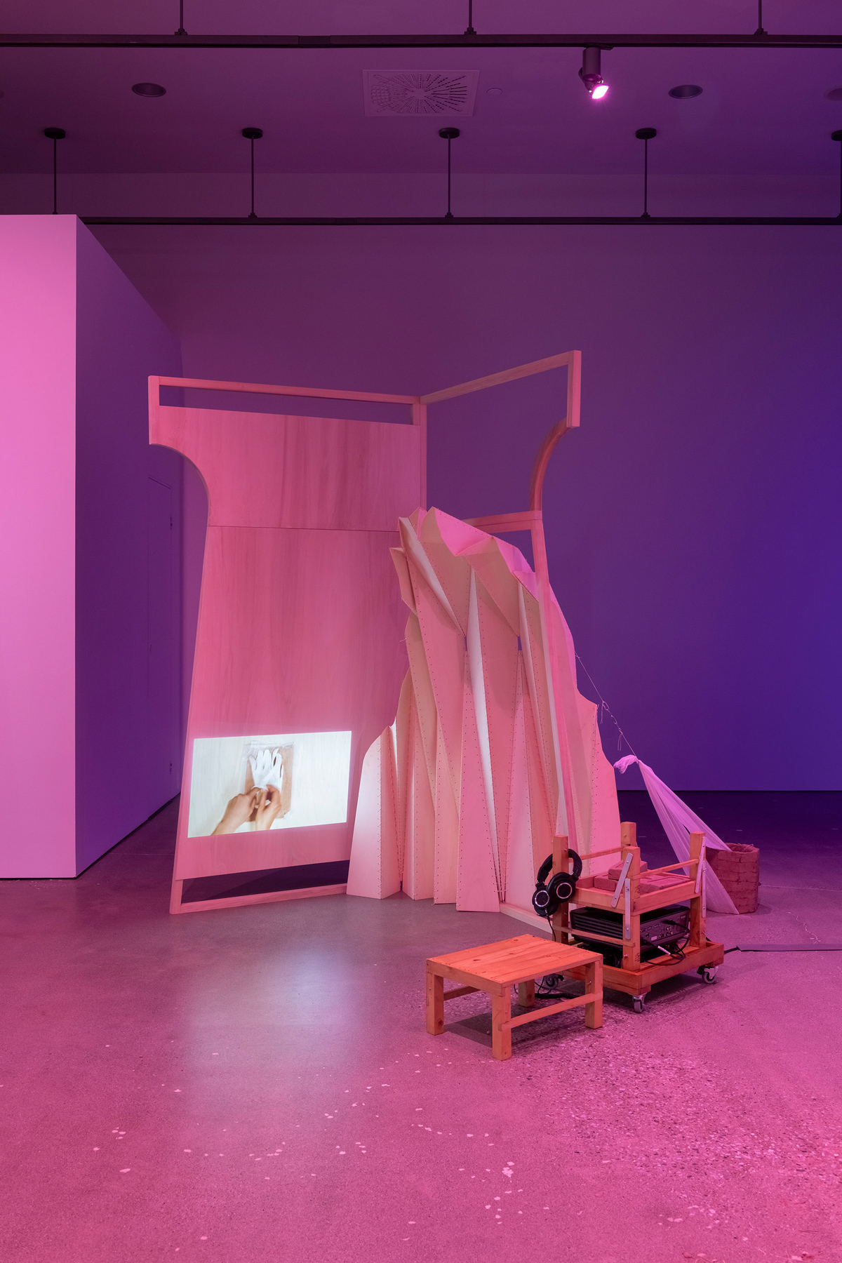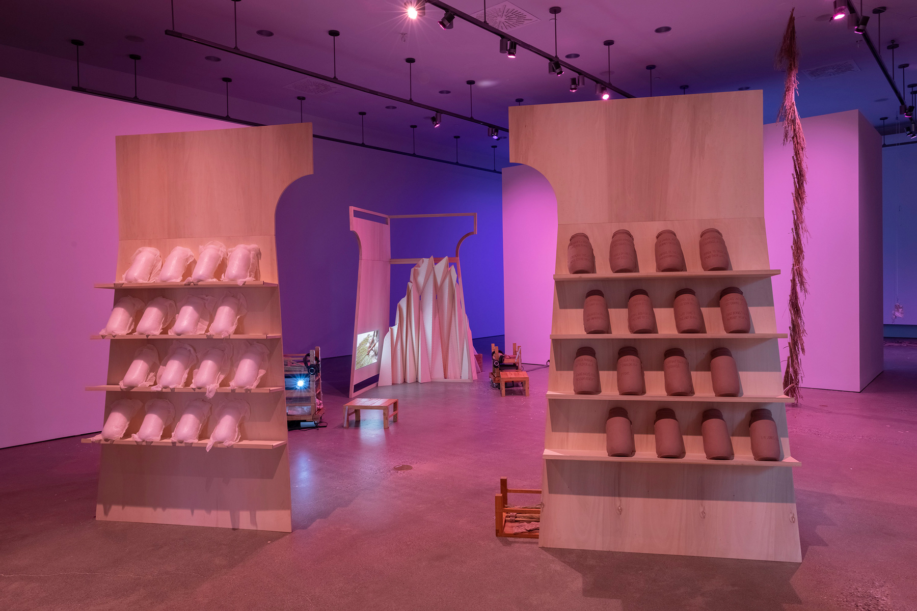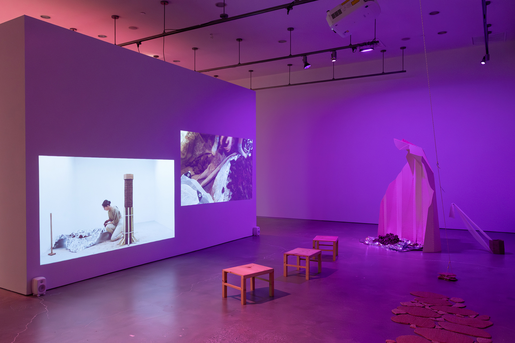 The exhibition delves into these stories and the ideas about land, heritage, and dispossession that they evoke. By traversing layers of history, gestures, and voices, Verviers probes the cracks of a divisive economic system to reinvent forms of “living together.” In order to create a dialogue between them, she uses the actions of churning to make mud bricks, adding fragments of thoughts to them. In the gallery, a reconstructed fragment of the Canadian pavilion at the 1886 Colonial and Indian Exhibition in London holds four videos representing different attempts at creating a dialogue between the personal and the political and perhaps rediscovering the meaning of working together.
