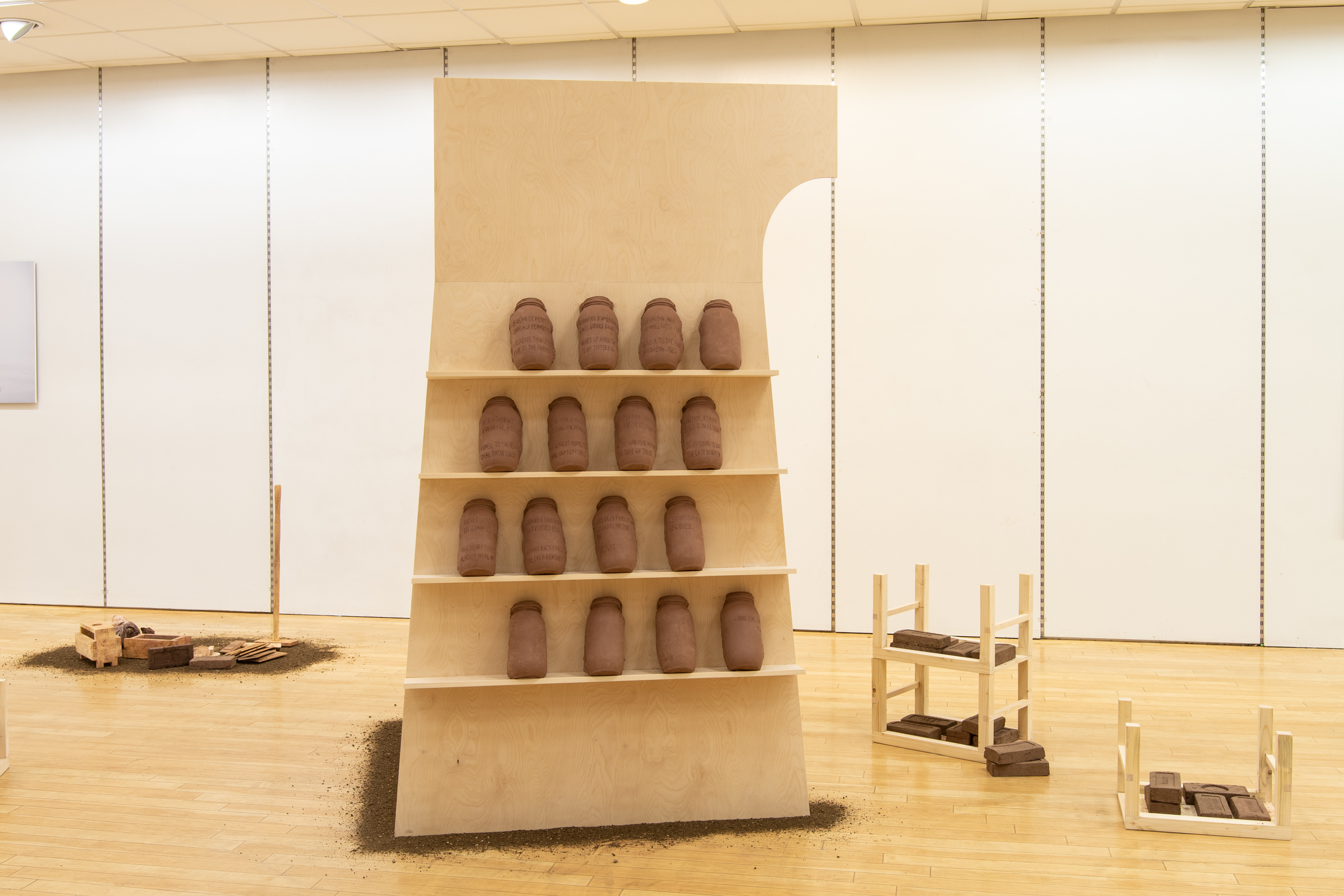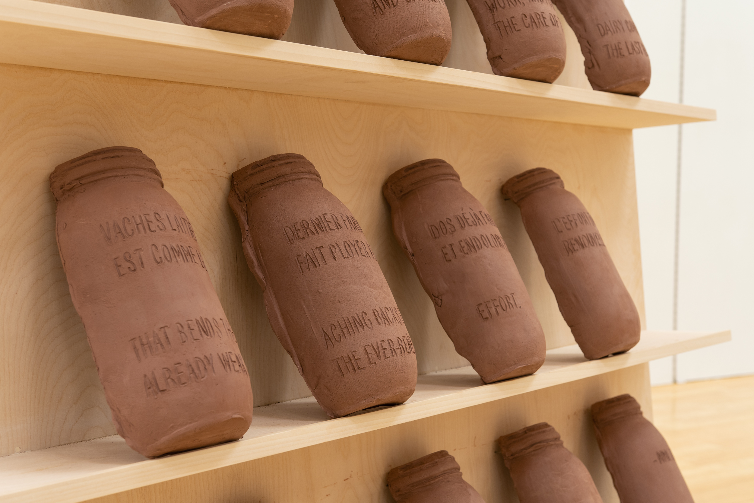 Showing off the wonders of Canadian agriculture preserved in glass jars, the Canadian pavilion at the 1886 Colonial Exhibition in London failed to acknowledge how "Canada's progress and resources" largerly relied on Indigenous people's and women's knowledge, workforce, and contribution. The plywood structure stands as a empty prop-like reproduction of a corner of that pavillion. On the shelves, the first sentence of feminist book about women's dairy knowledge from 1894 has been carved on the raw clay pots.