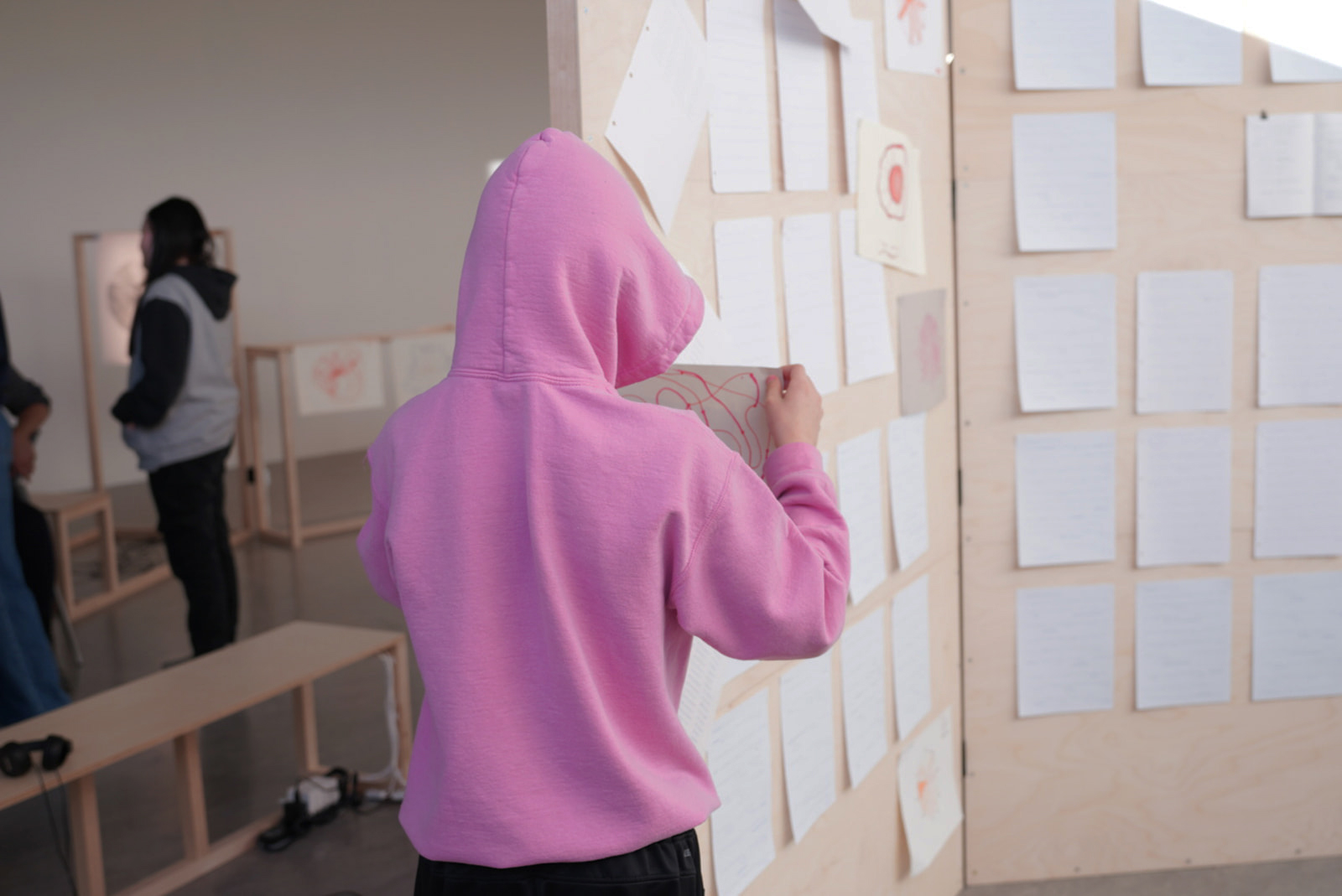 After each conversation, the students and the artist have drawing workshops to draw the structures of their exchanges. These drawings collectively help the group understand the power dynamics, relationships, support networks, etc., that arise through the weekly conversations. As the project moves along, the students will be invited to come and hang their own drawings in the exhibition space, wherever they wish, reclaiming the meaning of the installation and contributing to it. Week after week, the exhibition will evolve with the students asserting the importance of their involvement.