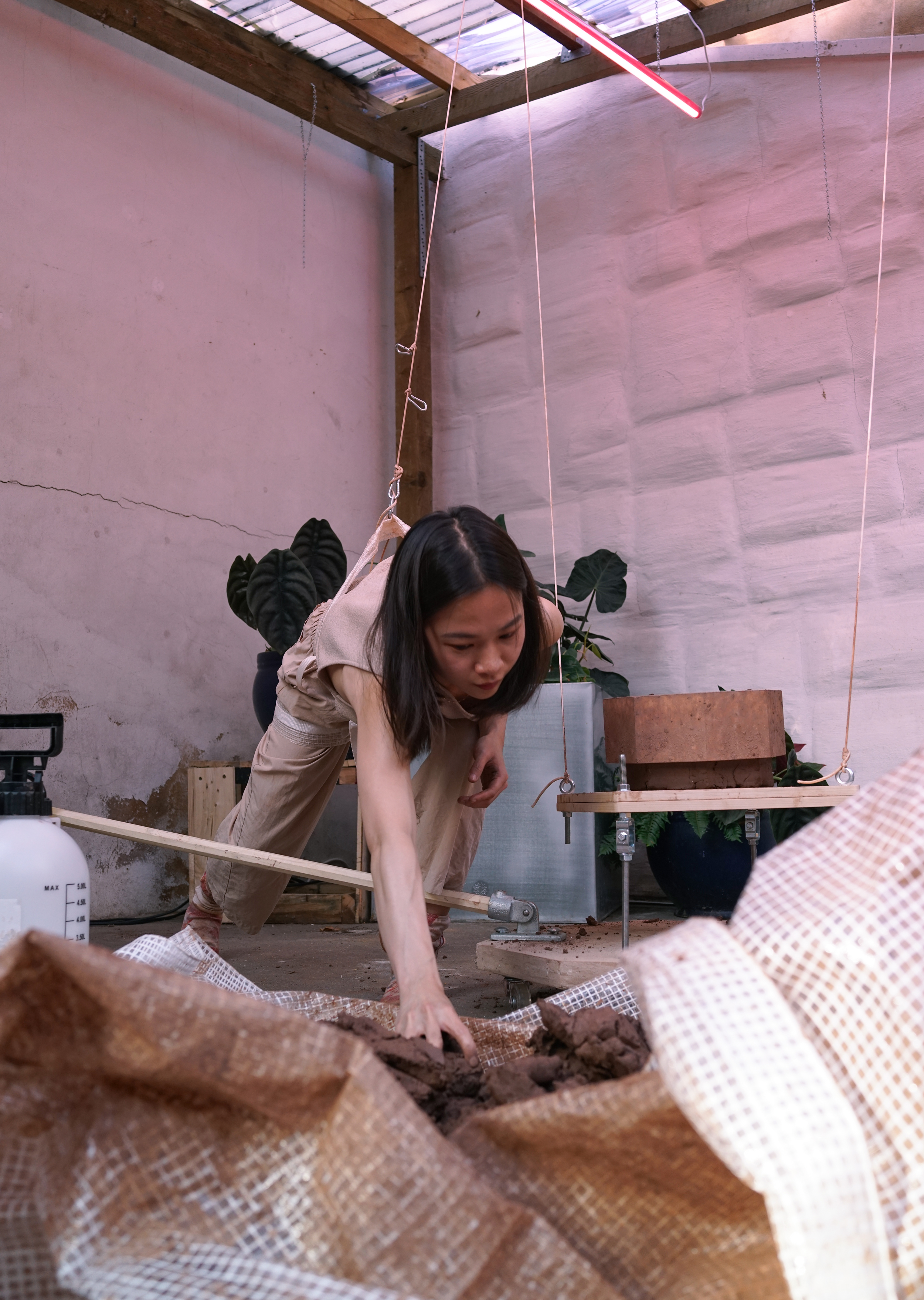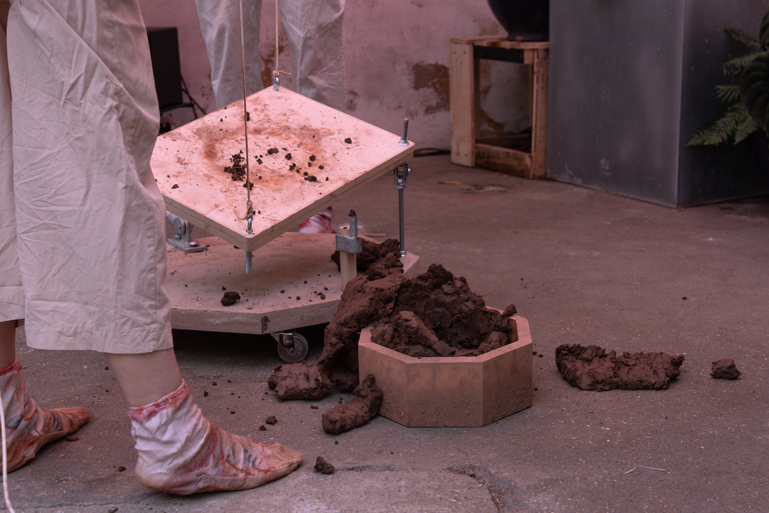 Calling on our many cells to muffle our twisting nerves long enough to learn how to walk level again Level again is a feminist science-fiction experiment weaving together ideas of chronic pain, ecological interconnectedness, and empowering exhaustion of womxn bodies. Performers are connected by cords to a platform on which they work together to build a column out of 75kg of cob – a mix of clay, sand, and hay. The movements of their bodies are communicated to the platform, angling the column as they build. When their construction inevitably collapses, they switch places and restart the game.