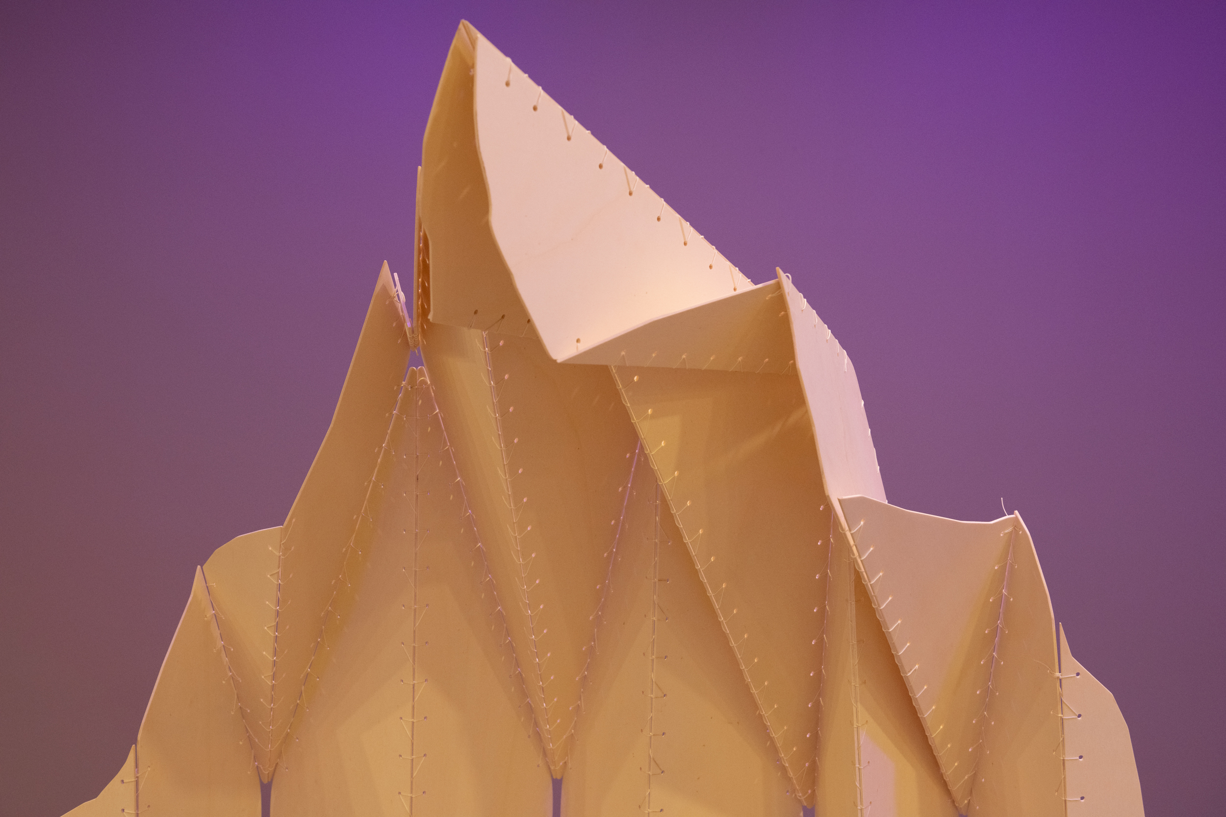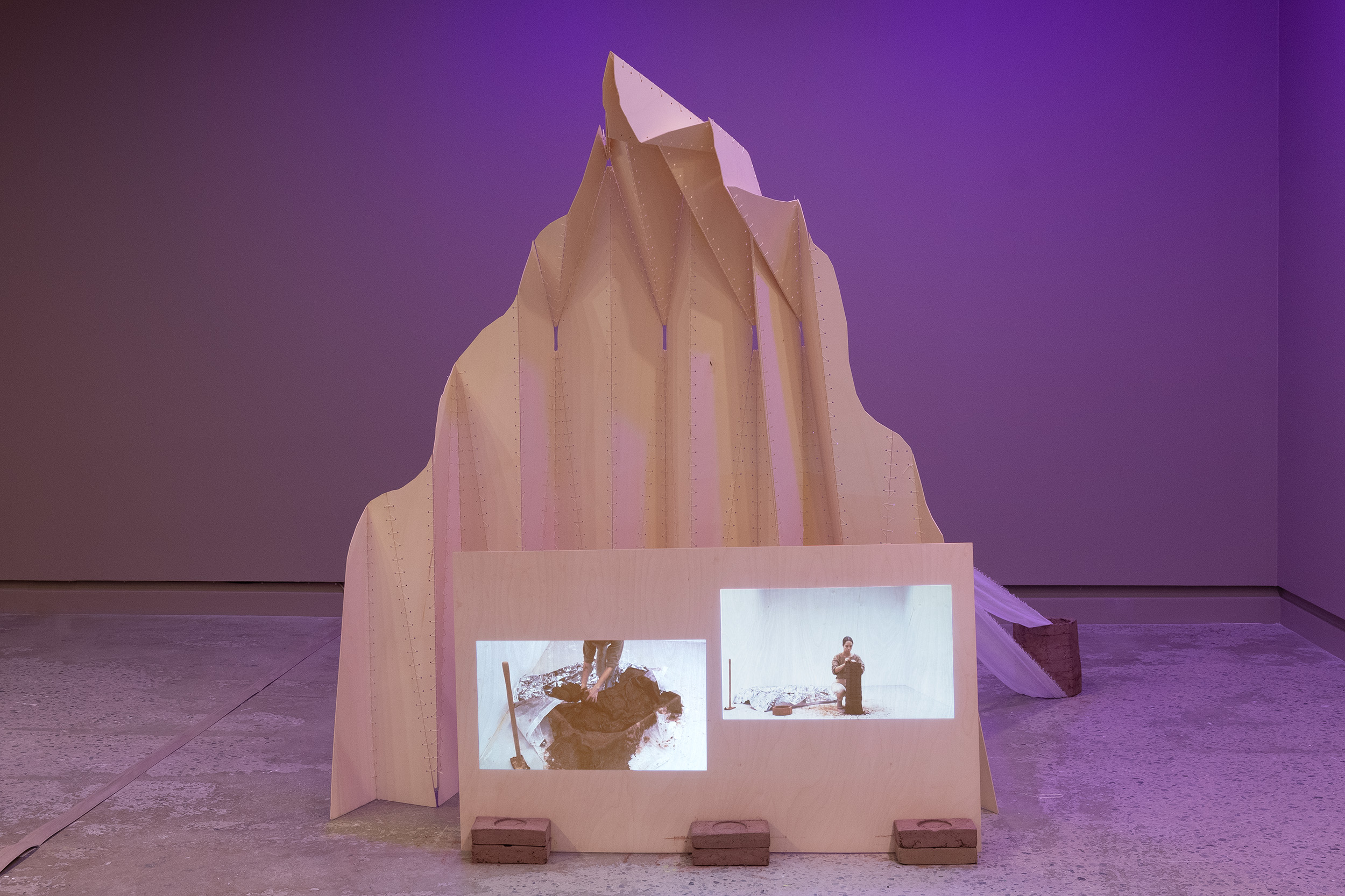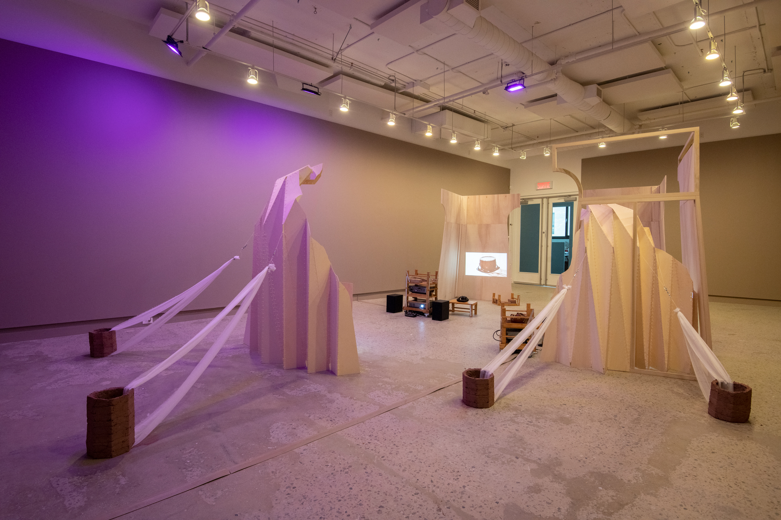 Installation. Poplar plywood, thread, cheese cloth, cob